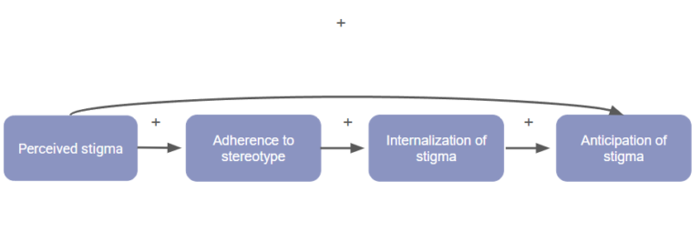 Perceived stigma will then lead to stereotype adherence. The more the membership of a stigmatised group is linked to factors considered controllable (substance use, incarceration, etc.), the stronger the adherence to the negative values and beliefs of its stigma. They will be perceived as true, thus endangering the self-image.
